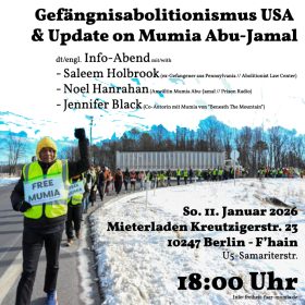 recording of show here: https://archive.org/details/2026-01-21-16h-radio-aktiv-mumia-update-abolitionism-engl On January 11, 2026 friends and supporters of US political prisoner Mumia Abu-Jamal spoke to a huge audiance in Berlin: […]