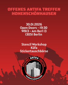 Offenes Antifa Treffen Hohenschönhausen am 30.01 // WB13 Am Berl 13, 13051 Berlin Am Freitag, den 30.01, findet das erste Offene Antifa Treffen Hohenschönhausen im […]