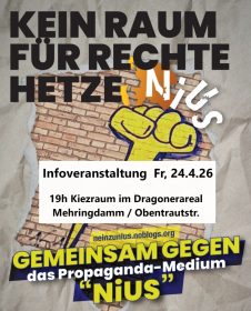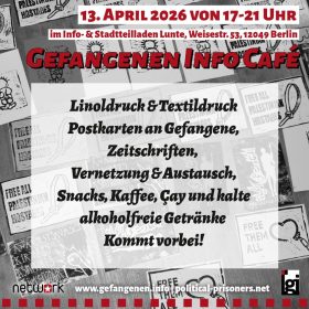 Wir laden Euch herzlich zum nächsten Gefangenen Info Café ein! Montag 13. April 2026 von 17-21 Uhr Info- & Stadtteilladen Lunte (Weisestr. 53, 12049 Berlin) […]