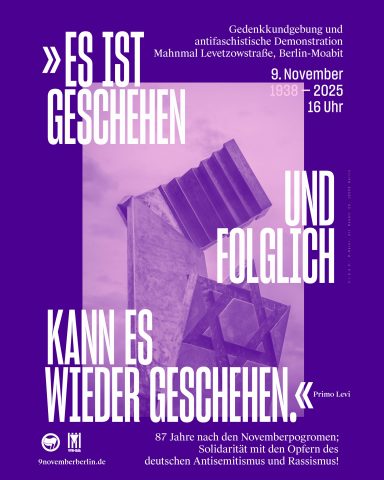 Als antifaschistisches Bündnis rufen wir am 9. November 2025, dem 87. Jahrestag der Novemberpogrome, zu einer Gedenkkundgebung am Mahnmal Levetzowstraße mit anschließender antifaschistischer Demonstration durch Moabit auf.