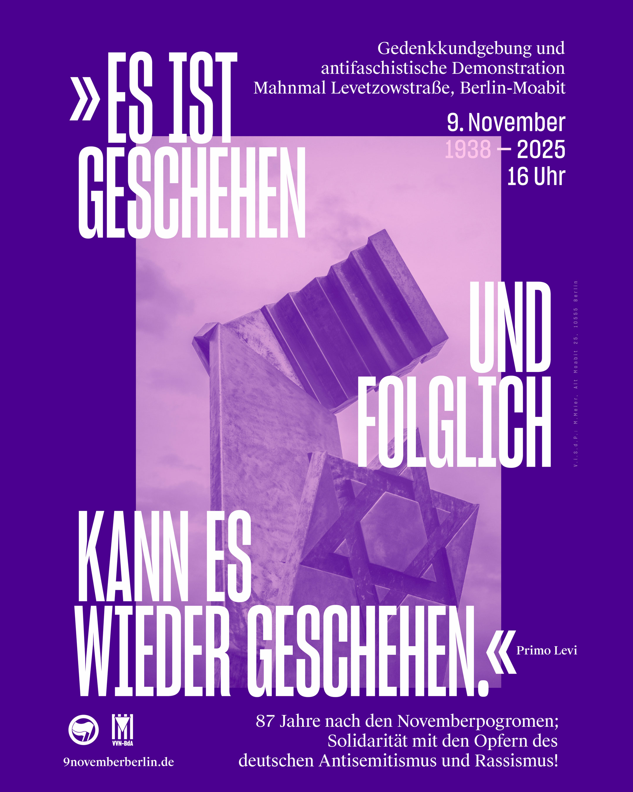 Als antifaschistisches Bündnis rufen wir am 9. November 2025, dem 87. Jahrestag der Novemberpogrome, zu einer Gedenkkundgebung am Mahnmal Levetzowstraße mit anschließender antifaschistischer Demonstration durch Moabit auf.