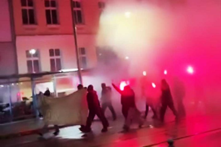 Trotz schlechtem Wetter waren wir viele, die lautstark und kämpferisch durch die Straßen zogen. Ausgiebig Pyro, Wurfzettel und weiterer Aktionen prägten das kraftvolle Auftreten dieser Sponti.