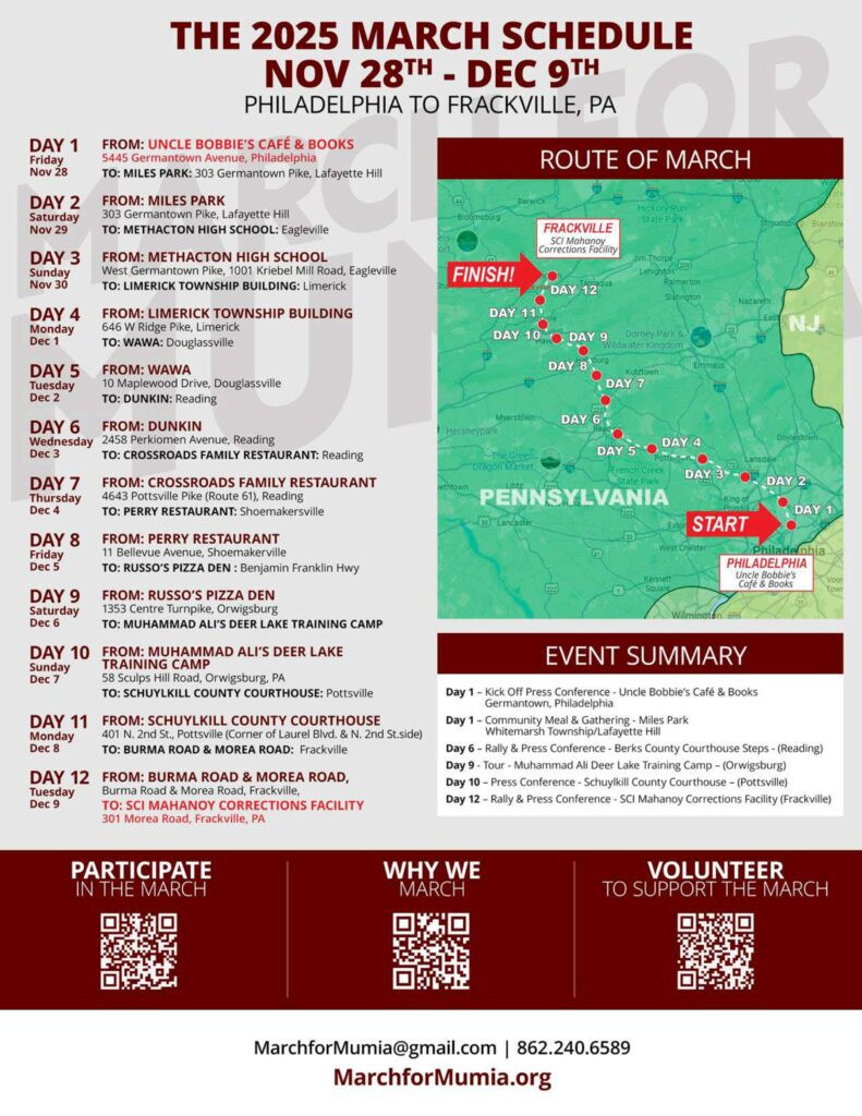 Diese fantastische Aktion wird am 28. November um 9 Uhr vor dem beliebten Uncle Bobbie’s Café and Book Shop in Philadelphia, 5445 Germantown Avenue, beginnen. Zwölf Tage später werden die Teilnehmer*innen am 9. Dezember, dem Jahrestag der schrecklichen Ereignisse, die Mumia ins Gefängnis brachten, am Gefängnis State Correctional Institution (SCI) in Frackville, Pennsylvania, ihren Marsch beenden.