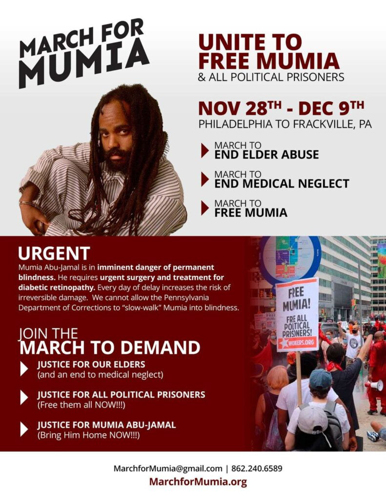 Muhammad weiter: „Die „Krankmachung Mumias“, um die Formulierung der radikalen Wissenschaftlerin Johanna Fernandez, Produzentin des hervorragenden Dokumentarfilms zu diesem Fall, Justice on Trial, zu verwenden, ist der explosive Auslöser, der diesen Marsch inspiriert. Der mittlerweile 71-jährige revolutionäre Journalist, der jetzt seit fast 44 Jahren in Haft ist, musste die Verschlechterung seiner Sehfähigkeit aufgrund diabetischer Netzhautschädigung erleben, eine Diagnose, die er vor zehn Monaten erhielt und die eine sofortige chirurgische Behandlung erfordert hätte.“