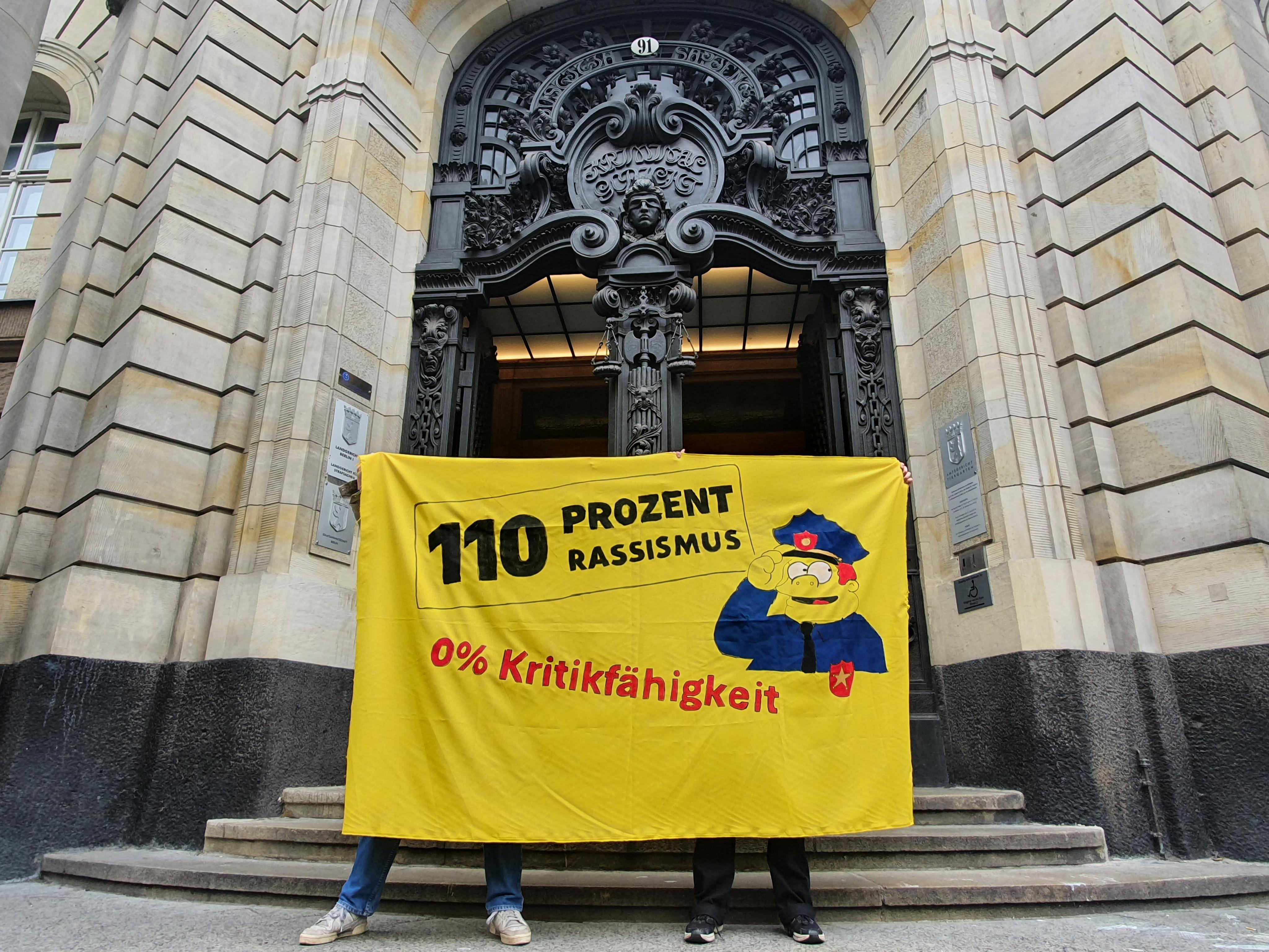 Anlässlich eines Gerichtsprozesses im August 2025 posierten Aktivist:innen aus Solidarität mit dem Angeklagten mit einem Banner vor einer Berliner Polizeiwache. Auf dem gelben Banner stand „110% Rassismus – 0% Kritikfähigkeit“. Der abgebildete Polizist im Look der Zeichentrickserie „Die Simpsons“ hebt ratlos seine Dienstmütze. Denn dem Angeklagten wurde vorgeworfen, mit aufgeklebten Sprechblasen auf Werbeplakaten die Polizei wegen Gewalt und Rassismus kritisiert zu haben: