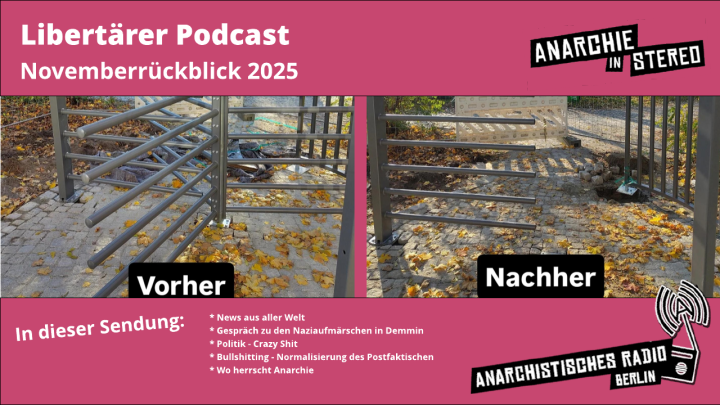 Das A-Radio Berlin präsentiert den neuen Libertären Podcast mit dem Novemberrückblick 2025: unser ernster und satirischer Blick auf die Geschehnisse des Vormonats. Mit News aus aller Welt, einem Gespräch zu den Naziaufmärschen in Demmin, einem satirischen Blick auf die Weltpolitik, einem Vortrag zur KI-Kritik, Wo herrscht Anarchie, Musik u.v.m.