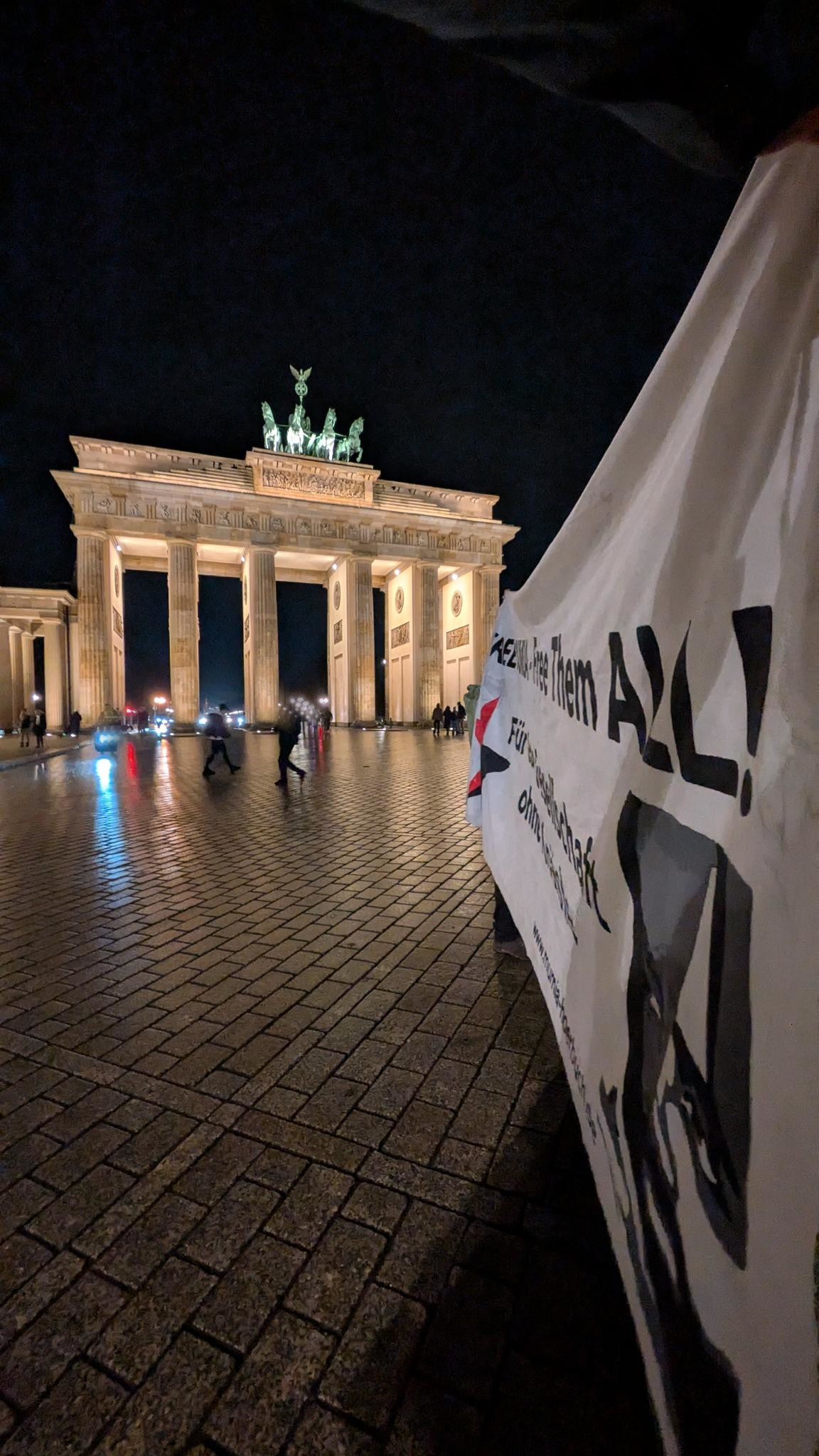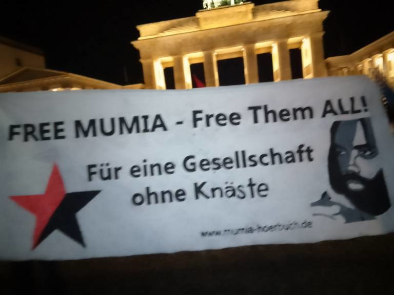 Am Dienstag, den 9. Dezember 2025 demonstrierten ca. 40 Menschen vor der US Botschaft am Pariser Platz in Solidarität mit Mumia Abu-Jamal. Der afroamerikanische Journalist ist für einen untergeschobenen Polizistenmord, für den es keine haltbaren Beweise gibt, seit 44. (!) Jahren im US Bundesstaat Pennsylvania in Haft. Zeitgleich demonstrierten Menschen für seine Freiheit in Pennsylvania vor dem SCI Mahanoy Gefängnis, in dem er festgehalten wird, sowie in Bern, London und Mexico City vor diplomatischen US Einrichtungen. Bereits am Mittwoch hatte es einen ähnlichen Protest in Paris vor der US Botschaft gegeben.
