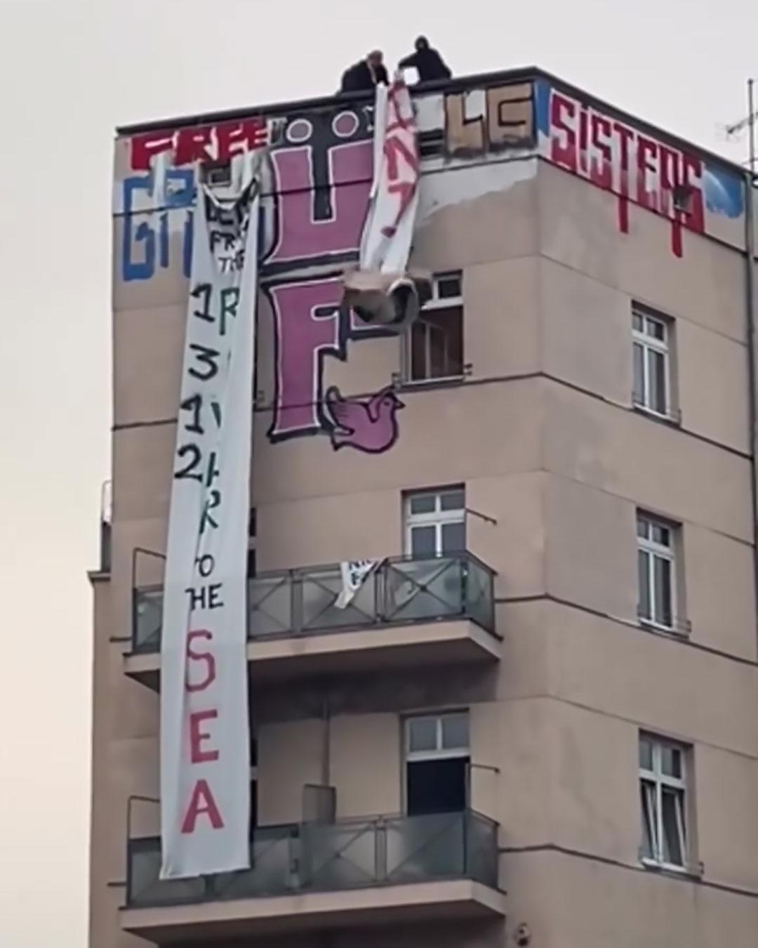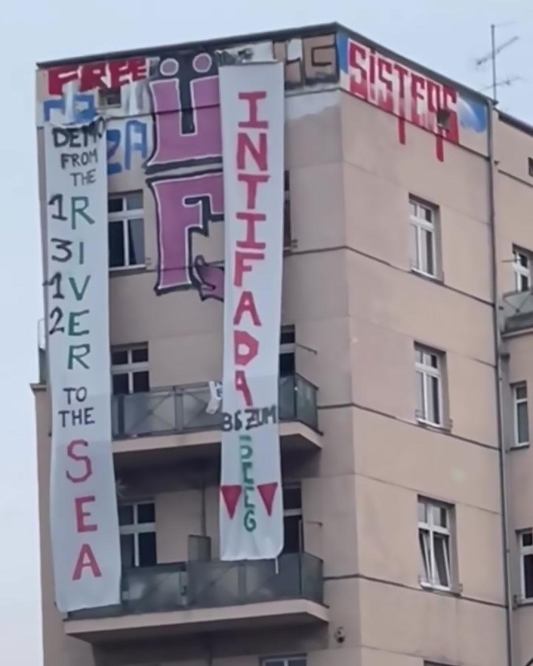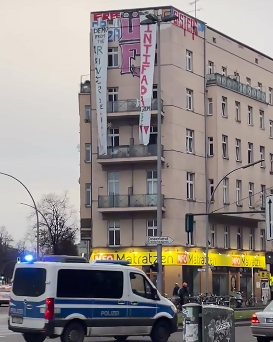 Auf den Bannern die von einem mehrstöckigen Gebäude in Kreuzberg heruntergelassen wurden stehen die Slogans „1312 – From the river to the sea“ und „Intifada bis zum Sieg“.