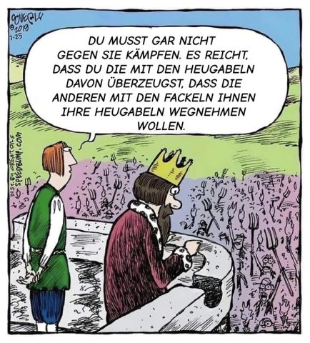 Wer hierzu applaudiert, weil es einen halluzinierten internen „Feind“ getroffen hat, sei an Niemöllers Gedicht „Als sie die Kommunisten holten, habe ich geschwiegen…“5 erinnert! Wer hierzu applaudiert, sollte mal neben sich schauen und dann vielleicht feststellen, dass mensch sich in einer üblen Querfront mit Rechten im Schulterschluss befindet, die inzwischen jede linke Systemkritik missbrauchen und auch mit Antisemitismus- und sogar Nazikeulen agieren. Der rechte Rollback geht global in breiter Front und mit der üblichen Salami-Taktik vor und in absehbarer Zeit werden diese Claqueure als Salamischeibchen enden, wenn sie nicht von ihrem Wahn herunterkommen. Währenddessen bekämpfen sich Gruppen und Strömungen untereinander und werfen sich dabei gegenseitig Autoritarismus vor – was bester Orwellscher Neusprech ist, weil alle Seiten allein durch den kämpferischen Umgang untereinander autoritär sind.