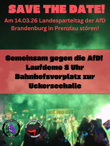 In Prenzlau und der Uckermark ist es dringend als Antifaschist*innen präsent zu sein und die Gegenpositionen stark zu machen. Lasst uns am 14. März alle nach Prenzlau fahren und gegen die AfD protestieren! Demo am 14. März morgens 8 Uhr Bahnhof Prenzlau.