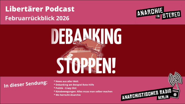 Das A-Radio Berlin präsentiert den neuen Libertären Podcast mit dem Februarrückblick 2026: unser ernster und satirischer Blick auf die Geschehnisse des Vormonats. Mit News aus aller Welt, einem Beitrag zum Thema Debanking, unserer Politik-Satire, eine Buchvorstellung zu Rätebewegungen, Wo herrscht Anarchie, Musik u.v.m.
