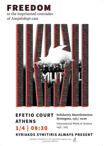 On Wednesday, April 1st (9am), at the 2nd three-member Criminal Appeals Court in Loukareos, Athens (4th floor, room D100C), the trial begins for our detained comrades who are being prosecuted for the explosion in an apartment in Ampelokipi. We call for a solidarity rally on that day, as well as on the next trials to be scheduled.