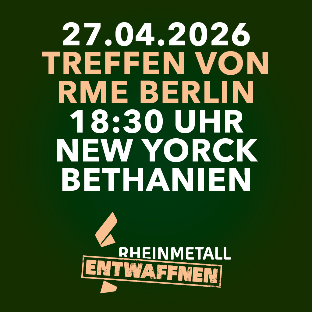 Kommt dafür am Montag, den 27. April 2026 um 18:30 Uhr ins NewYorck Bethanien, Mariannenplatz 2a, 10999 Berlin-Kreuzberg, 2. Etage. Oder schreibt uns eine E-Mail: rheinmetall-entwaffnen-berlin@ riseup.net
