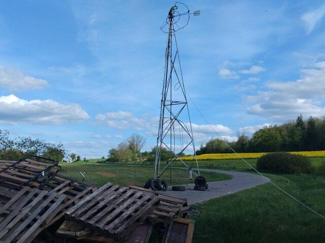 – Eine Windkraftanlage von etwa ~10 m Höhe lässt sich von etwa zwanzig Personen + Seilen aufstellen