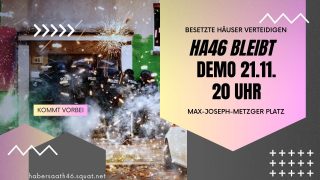 Demo 21.11.25! Habersaathstr. 46 bleibt! Selbstorganisierten Wohnraum erkämpfen und verteidigen! vorraussichtlicher Startpunkt: Max-Joseph-Metzger Platz (nähe S + U Wedding) um 20 Uhr Jede* r sieht es mit eigenen Augen: das Leben, die Stadt, allgemein der Umgang in dieser Gesellschaft wird immer beschissener. Nach unten treten wird wieder *in*. Die Linke Bewegung ist keine ausreichend starke Kraft mehr die hier mit […]