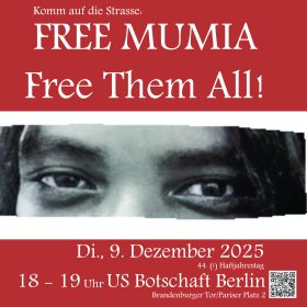 Dienstag, 9. Dezember – US Botschaft Berlin – 18 – 19:00 Uhr Am Dienstag, den 9. Dezember 2025 sitzt der afroamerikanische Journalist Mumia Abu-Jamal 44 (!) Jahre für einen untergeschobenen Polizistenmord in Haft. Mumia hat als Journalist bereits vor Jahrzehnten über Konzernherrschaft, autoritäre und rassistisch motivierte Repression sowie tödliche Polizeigewalt in den USA berichtet und diese kritisiert, als seine Kolleg*innen […]