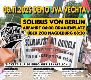 Happy Birthday Daniela! Kommt zur Demo am 8. November 2025 nach Vechta – Sich nicht von Unterdrückung abschrecken lassen heißt für uns auch Solidarität mit Daniela Klette! Die Demo beginnt um 13:30 Uhr am Bahnhof Vechta und läuft zur JVA Vechta. Abfahrt Berlin 08.11. | 06:00 Uhr | Oranienplatz, Berlin-Kreuzberg Abfahrt Magdeburg 08.11. | 08:30 Uhr | ZOB Magdeburg Tickets […]