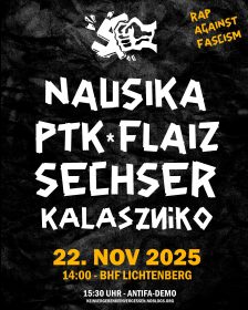 🔥RAP AGAINST FASCISM🔥 SA. 22. NOVEMBER 2025 14:00 | BHF. LICHTENBERG EUGENIU BOTNARI-PLATZ 🎤LIVE: Nausika | https://www.instagram.com/nausika.music PTK | https://www.instagram.com/ptk.ptk Sechser (Teuterecords) | https://www.instagram.com/sechser.teute Flaiz | https://www.instagram.com/flaiz_musik Kalaszniko | https://www.instagram.com/kalaszniko7 Erst Konzert und dann ab 15:30 Uhr antifaschistische Demo vom Bündnis „Kein vergeben! Kein vergessen!“ durch Lichtenberg. Gegen rechte Gewalt, gegen Faschos und ihre Treffpunkte und für ein lautstarkes und […]