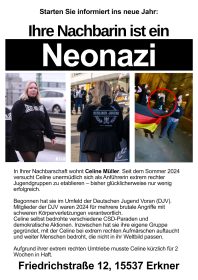 Celine Müller (Friedrichstraße 12, 15537 Erkner) bewegt sich seit Längerem im Umfeld der „Deutschen Jugend Voran“. Seit Mitte 2024 tritt sie öffentlich bei extrem rechten Demonstrationen in Erscheinung und versucht sich zu organisieren. Bislang waren ihre Bemühungen weitgehend erfolglos, weshalb sie eigene Gruppen gegründet oder bereits totgesagte Labels wiederbelebt hat. Aktuell tritt sie unter dem Namen „Berliner Jugend“ auf. Besonders […]