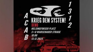 13.12. | 18:00 | Helsingforser Platz, Berlin (S+U Warschauer Straße) —english below— ACAB BEDEUTET ALL COLONIZERS ARE TARGETS LAND BACK GLORY TO THE RESISTANCE Am 13.12. tragen wir unsere Wut auf die Straßen. Gegen das gesamte System von Kontrolle, Knast, Kolonialismus, Grenzen und Genozid, das die Polizei jeden Tag verkörpert und verteidigt. Gegen ihren rassistischen Normalzustand, gegen ihr Profiling, ihre […]