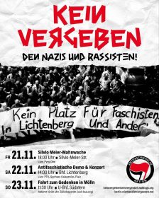 Gegen Nazitreffpunkte, Rassismus und soziale Ausgrenzung! In Gedenken an alle Opfer rechter Gewalt. KEIN VERGEBEN – den Nazis und Rassisten! KEIN VERGESSEN – der Opfer rechter Gewalt! 14:00 KONZERT- Vorplatz Bahnhof Lichtenberg: PTK, Sechser (Teuterecords), Kalaszniko, t.b.a. 15:30 DEMO-BEGINN INFOS: • https://keinvergebenkeinvergessen.noblogs.org • https://www.instagram.com/keinvergeben_keinvergessen • https://berlin.niemandistvergessen.net SOLIDARISCH BLEIBEN: Wir wünschen uns am 22. November eine Demonstration, auf der sich möglichst […]