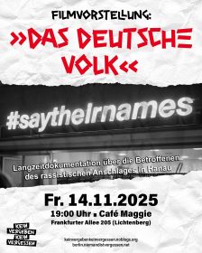 Fr. 14.11.2025 19:00 Uhr Cafe Maggie Frankfurter Allee 205, 10365 Berlin (Lichtenberg) Anfahrt: U-Bhf. Magdalenenstraße (U5) Deuschland 2025, 132 Min, Regier: Marcin Wierzchowski Mit: Mitwirkende Çetin Gültekin , Emiş Gürbüz, Said Etris Hashemi, Armin Kurtović, Piter Minnemann, Niculescu Păuns u. a. Trailer: https://www.youtube.com/watch?v=AP1dN_HF9V4 Website: https://dasdeutschevolk.de/ In der Nacht des 19. Februar 2020 reißt ein rassistischer Anschlag in Hanau neun junge […]