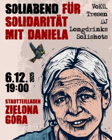 06.12.2025 | 19:00 STADTTEILLADEN ZIELONA GÓRA, GRÜNBERGER_STR_73, BERLIN-FRIEDRICHSHAIN VoKü, Tresen, DJ, Longdrinks und Solishots Am 26.2.2024 wurde Daniela Klette, die als mutmaßliches ehemaliges RAF-Mitglied über 30 Jahre gesucht wurde, in Berlin festgenommen und war 2 Monate in der JVA Vechta Isolationshaft/ -folter, permanenter Videoüberwachung und durchgehender Zensur ausgesetzt. Wir setzen uns als Unterstützerinnen gegen diese Klassenjustiz und die Haftbedingungen ein […]
