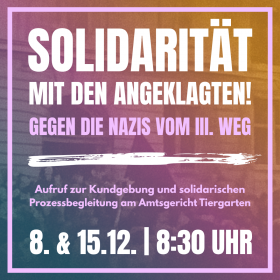 (–english below–) Am Donnerstag, den 26.06.2025, finden Kundgebungen an zwei Orten statt, die durch eine Lauf-Demo verbunden werden! 1. Prozess + Kundgebung: 09:00 Amtsgericht Kirchstraße 6, Berlin 2. Prozess + Kundgebung: 12:30 Amtsgericht Turmstraße 91, Berlin Die Absurdität des deutschen Rechtssystems erreicht ein nie dagewesenes Ausmaß. Jegliche Illusionen von „Rechtsstaat“ sind längst zerstört. Lasst uns am 26. am Start sein […]